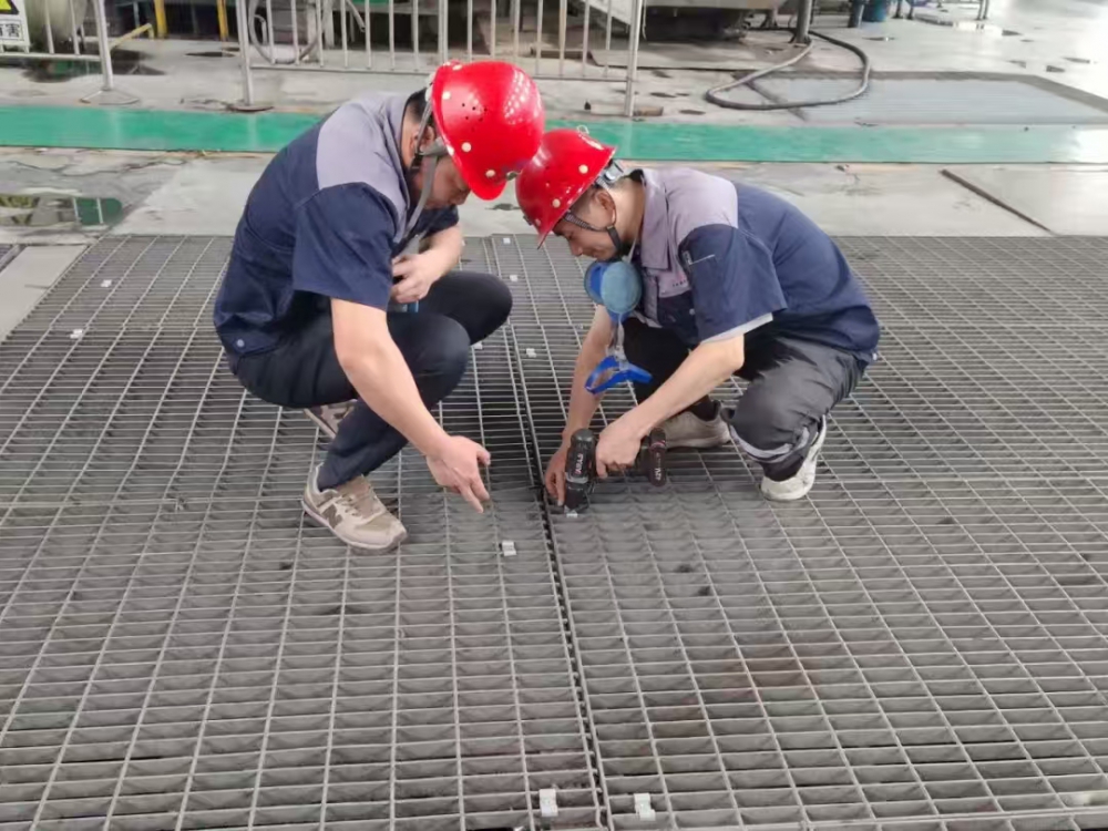 突出問(wèn)題精準(zhǔn)治理。一選廠(chǎng)已生產(chǎn)運(yùn)行多年,濃密車(chē)間人行通道地板腐蝕嚴(yán)重,數(shù)次進(jìn)行修修補(bǔ)補(bǔ),存在較大安全隱患。為徹底解除隱患,公司利用停機(jī)間隙,籌集資金、人力、物資,對(duì)70米通道的地板、護(hù)欄、橫梁和支柱進(jìn)行全面拆除更換,有效保障了作業(yè)區(qū)域安全;同時(shí),為汲取內(nèi)蒙古“7.23”格柵板脫落事故的教訓(xùn),切實(shí)保障員工及參觀(guān)人員的生命安全,公司購(gòu)買(mǎi)8000套固定卡扣,對(duì)兩個(gè)選廠(chǎng)磨浮車(chē)間格柵板進(jìn)行加固處理,并在參觀(guān)通道設(shè)立了安全提示牌。