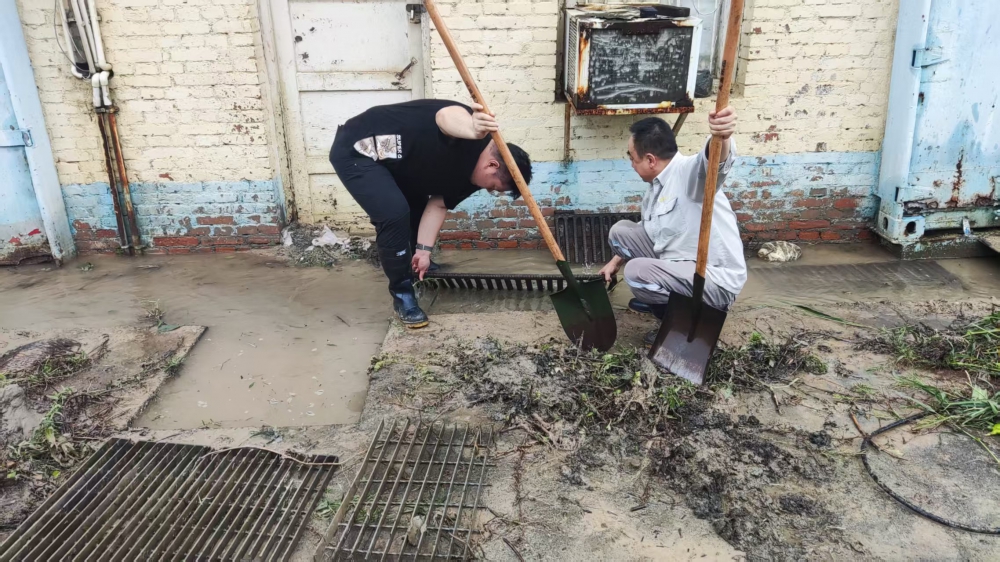 “物資庫房絕不能進水!”——這不僅是堅定的指令,更是機動能源部全體人員共同的信念。在暴雨和泥濘中,他們手持鐵鍬,俯身清理排水格柵,徒手掏挖淤積雜物,半蹲調整工具角度,一鏟一鏟將堵塞物歸攏清運。雨水與汗水交織,浸透工裝,污泥遍身,卻無人退縮。這支隊伍中不乏年長的老同志,他們連續數小時奮戰在積水最深、任務最重的地段,以實際行動詮釋了能源鐵軍的責任與擔當。